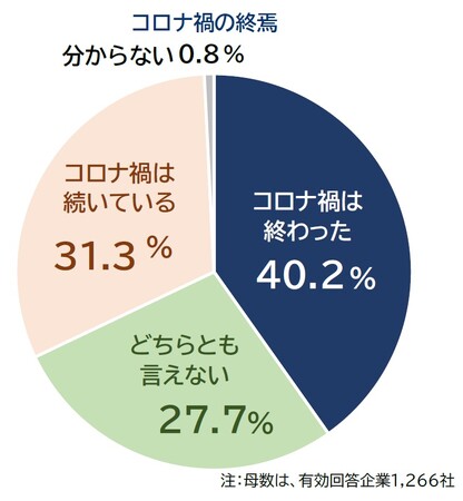 「コロナ禍は終わった」とする企業は40.2%にとどまった。他方、「どちらとも言えない」は27.7%、「コロナ禍は続いている」と捉える企業は31.3%だった