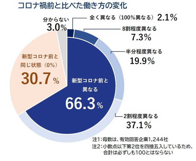 新型コロナの流行前(2019年以前)と比較し、自社の働き方が多少なりとも『異なる』とした企業は66.3%。他方、3割の企業で働き方は変わらず