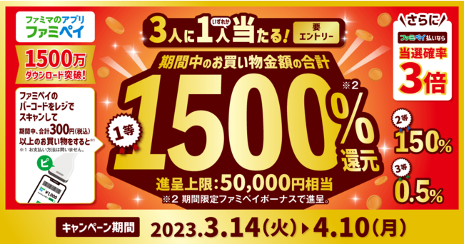 株式会社ファミリーマート(本社:東京都港区、代表取締役社長:細見研介)は、継続して取り組んでいる5つのキーワードの1つである「たのしいおトク」の一環として、またファミマのアプリ「ファミペイ」(以下:「ファミペイ」)の1,500万ダウンロード突破を記念して、「ファミペイ」のバーコードをスキャンして、期間中300円(税込)以上のお買い物をすると、最大50,000円相当のファミペイボーナスが当たる「最大1500%還元!ファミマのアプリ出すだけチャレンジ」キャンペーンを2023年3月14日(火)より実施いたします。
