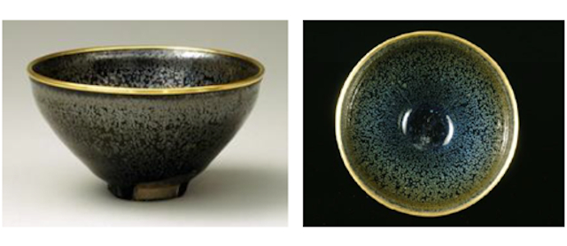 ※2 特殊な技法で焼き上げることで、鉄を主成分とした鉱物が結晶化し、器の内外に油の滴のような小さい斑点模様が見られる茶碗を指します。南宋時代(12~13世紀)に中国南部の建窯(けんよう)で誕生した喫茶茶碗の一種です。