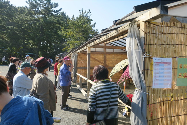 子氏による菊花の生け込みが古民家とコラボレーション。今年は初めて、三溪園の学芸員、フラワーデザイナー、菊づくり名人とともに菊花展の鑑賞と通常非公開の建物内で菊花の手入れ体験や、抹茶と菓子も楽しめる「菊花展プレミアムツアー『菊めぐり』」も開催します。