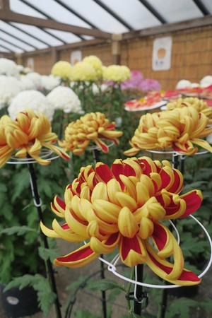 大菊は花の直径が18センチ以上のもので「厚物」「管物」「広物」の3種類に分かれ見た 目も全く違う大輪の花です。一本の小菊を大きく長く育て、びっしりと花に覆われた滝の ような形の懸崖、一本の茎からの多く花をドーム型に咲かせる千輪作り、折れたり曲 がったりした花弁の江戸菊・古典三菊など色や種類も豊かな400点ほどを「横浜菊花 会」が展示します。