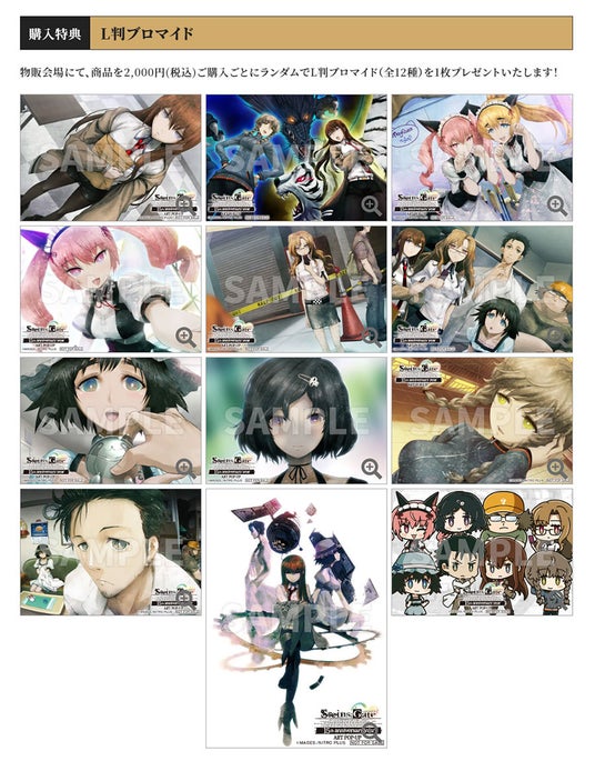 さらに来場購入特典として「STEINS;GATE」の関連商品¥10,000(税込)お買上ごとにキャラクターデザインhuke氏により今回の催事の為に描き下ろされた色紙風カード(B6サイズ)1枚をプレゼント!