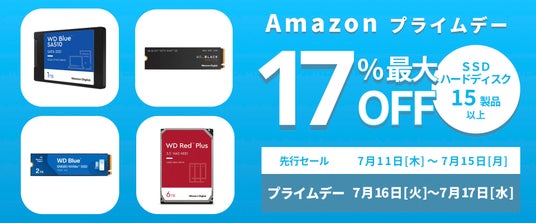 2024年7月16日(火)0:00から7月17日(水)23:59まで合計48時間にわたってAazonで開催される「プライムデー」と、7月11日(木)から開催される「プライムデー先行セール」において、WesternDigitalの人気製品が17%OFFとなる特別セールを実施します。