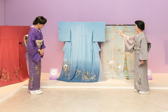 板谷さんは「このような素敵な作品を着る機会があり、日本人に生まれて本当によかったと思います。」と目を輝かせ、草乃先生に感謝を述べました。お二人で本展の見どころである源氏物語の章の作品の数々を鑑賞された板谷さんは「刺繍の細やかさ、糸のつややかさ。特に花々の刺繍作品に近づいて見てみると本当に美しい。絹糸が織りなすグラデーションに感動しました。伝統的な日本の着物というのは、自分から見てみたい、着たいと思わないと目にしない時代になりつつあります。是非本展にご来場いただき、素晴らしい作品の数々を間近で楽しんでいただきたいです。」と語りました。