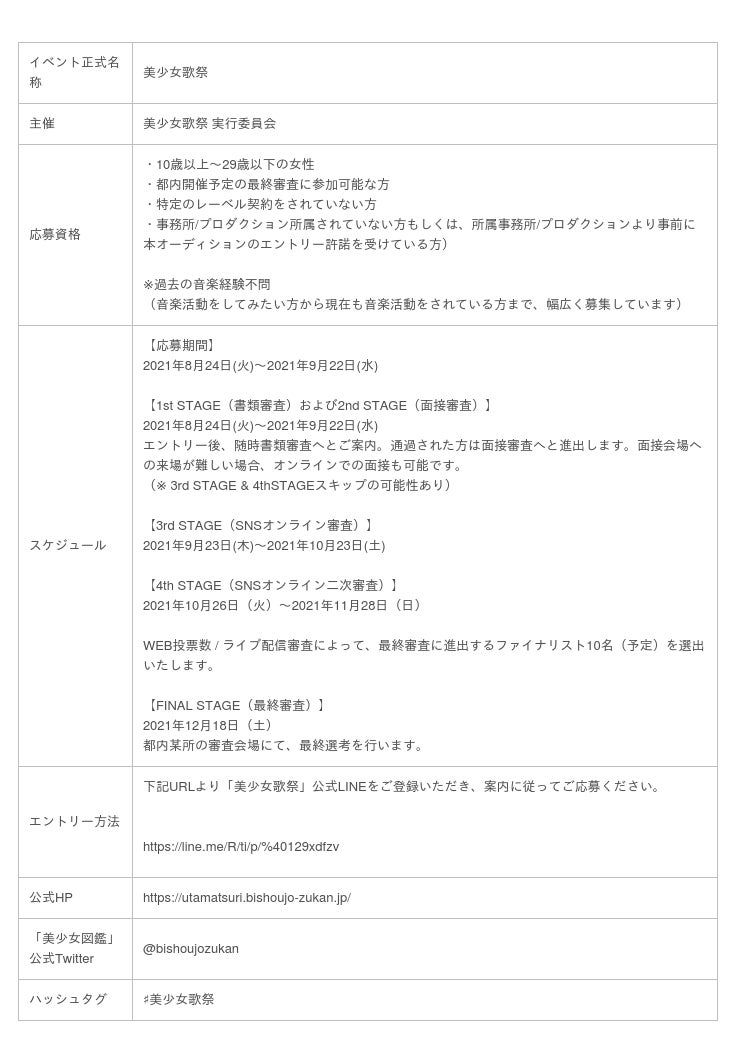 株式会社美少女図鑑(東京都渋谷区、代表取締役:中村 孔亮)が運営する地元の美少女を取り上げていく地域密着型メディア「美少女図鑑」は、2021年8月24日(火)より地方に眠る原石から次世代を担う女性シンガーの輩出を目的とした、女性シンガーの原石発掘オーディション『美少女歌祭』を開催しております。