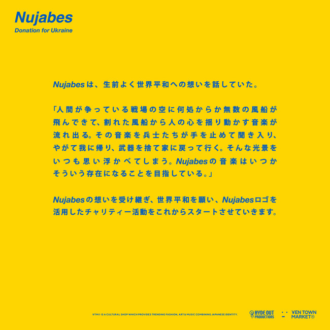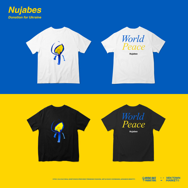 本日3月28日(月)よりカルチャーショップ「YEN TOWN MARKET(R)︎」 は、音楽プロデューサーNujabesと共に命にかかわる支援を必要としているウクライナの人々のためにチャリティーTシャツを製作し、利益の全額を寄付する事を発表した。