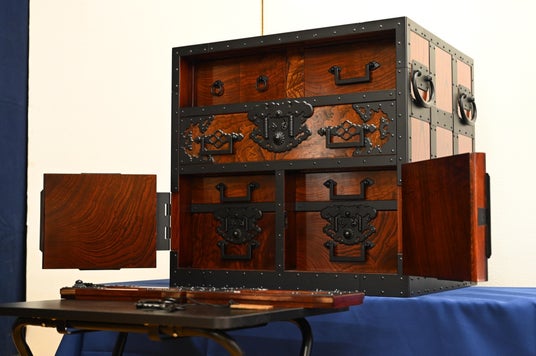船箪笥は、江戸中期から明治にかけて往来した商船・北前船の必需品として使われていた。なんと、船が難破しても海に沈まず、旅人の大切な荷物を守る金庫として重宝されていたという。