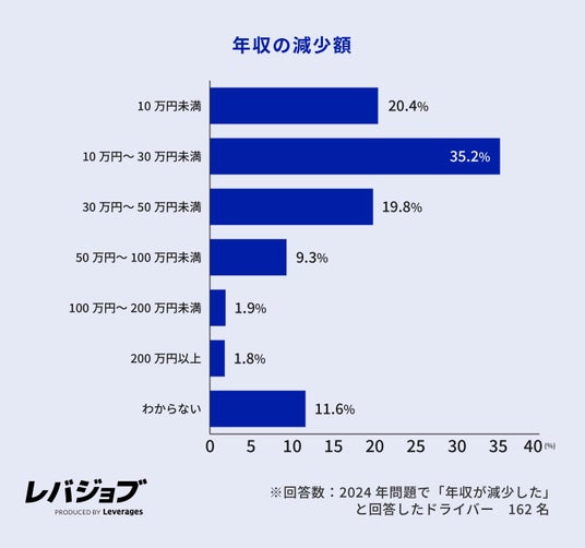 減少した額は「10万円~30万未満(35.2%)」が最多でした。働き方改革関連法による時間外労働上限規制は、ドライバーの労働時間短縮に貢献する一方で、一部のドライバーの年収減少につながっている可能性があると考えられます。