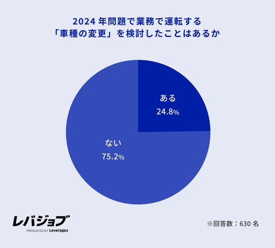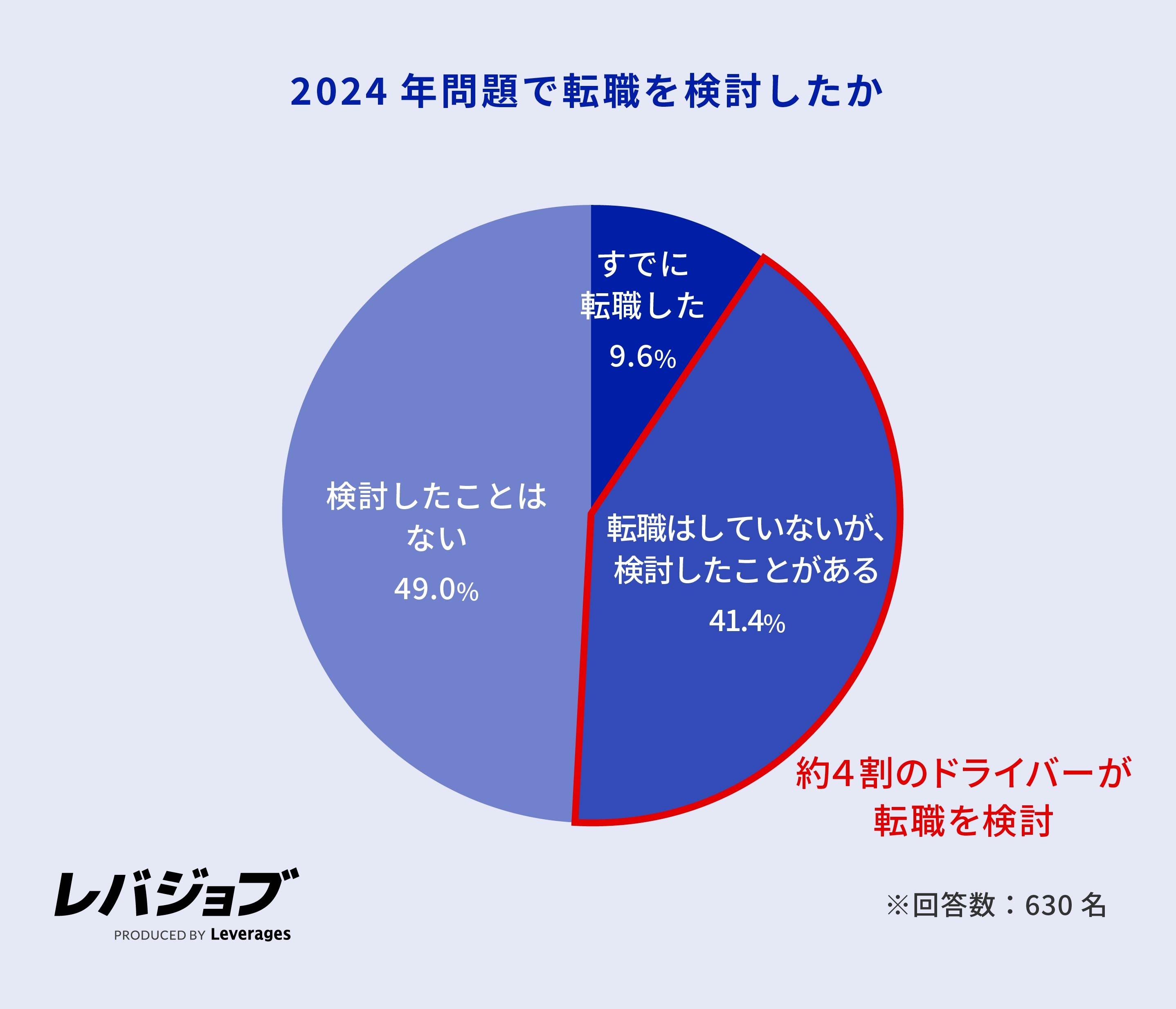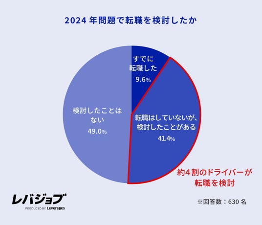 レバレジーズ株式会社が運営するエッセンシャルワーカー向けキャリア支援サービス「レバジョブ」は、ドライバー630名を対象に、時間外労働時間の制限による影響(2024年問題)に関する実態調査を実施しました。