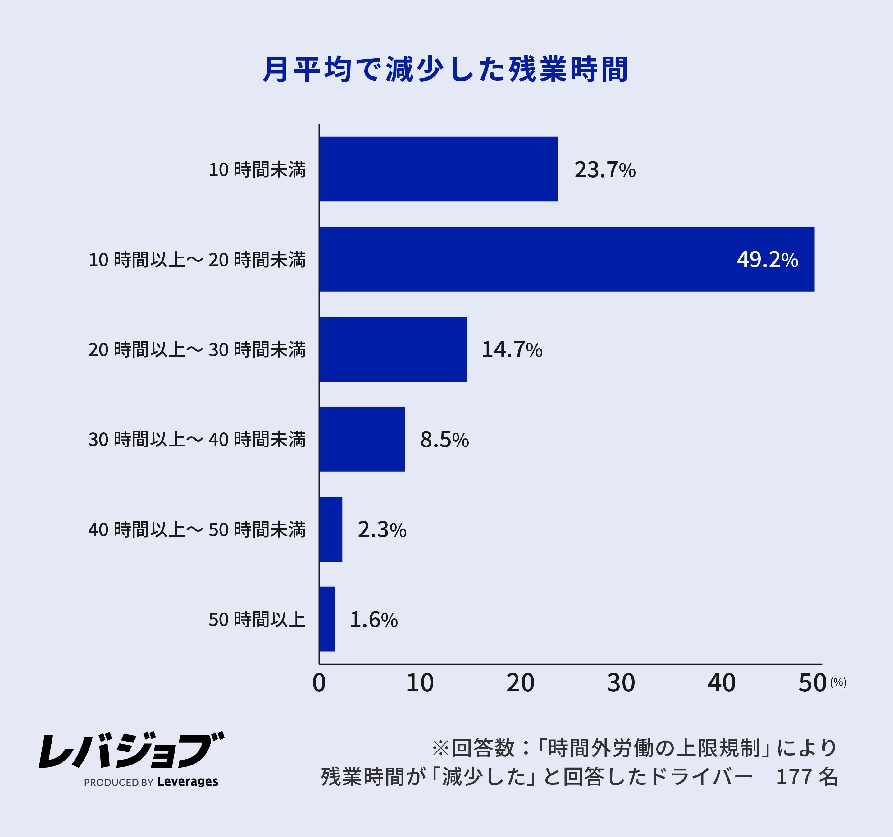 減少した月あたりの残業時間は「10時間以上~20時間未満(49.2%)」が最も多く、次いで「10時間未満(23.7%)」となりました。時間外労働の上限規制により、ドライバーの労働時間の短縮に一定の効果を発揮していることが分かります。