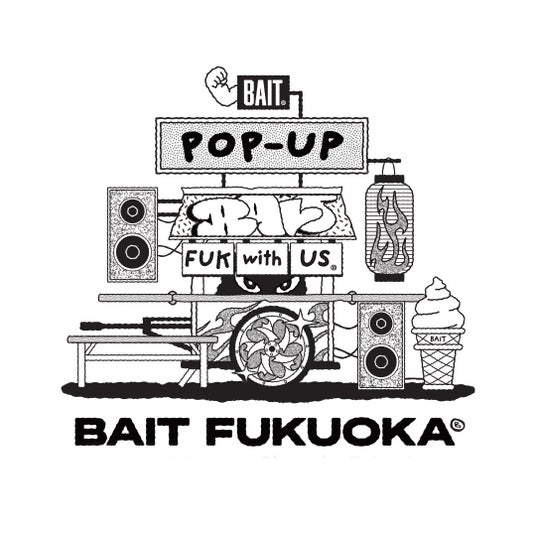 福岡の屋台からインスパイアされ、BAITによる今回のPOP UP STOREのために手掛けられたデザインはサウンドシステムなどが設置され、暖簾には「FUK with US」と綴られたエッジが効いた屋台を描いた限定アイテムとなっています。