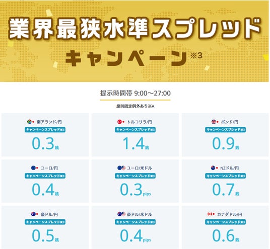 キャンペーンスプレッド掲示時間帯:対象期間中の各営業日午前9時~翌午前3時