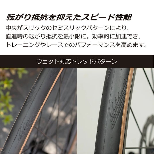 120TPIの高密度ケーシングによるしなやかさと、セミスリックパターンによる転がり性能で、