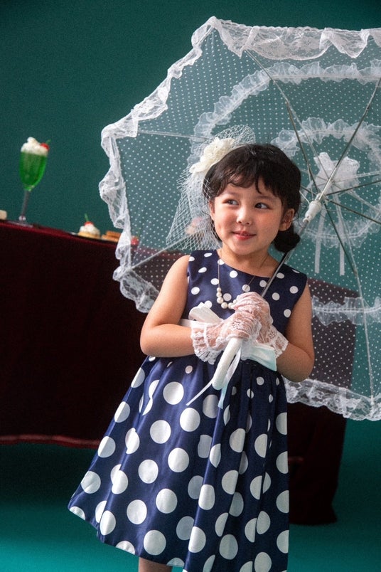 可愛らしいドット柄の中に小物でレースを合わせることで少し大人っぽくもあり上品な雰囲気を出すコーディネート。