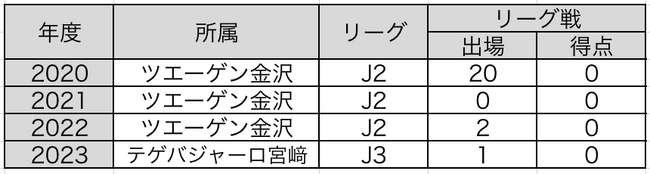 IRIS生野U-15 - 興國高校 - ツエーゲン金沢 - おこしやす京都AC(育成型期限付き) - ツエーゲン金沢 - テゲバジャーロ宮崎(期限付き)