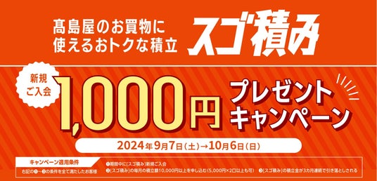 株式会社高島屋(本社:大阪市中央区、代表取締役社長:村田 善郎、以下「高島屋」)と株式会社高島屋友の会(本社:東京都中央区、代表取締役:高久 充)は、より多くのお客様に[スゴ積み]をご利用いただくために、2024年9月7日(土)から[スゴ積み]新規入会(毎月10,000円以上の積立て)で1,000円をプレゼントするキャンペーンを実施します。