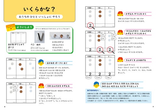 このセットでは「おかねがくしゅうボード」を使った「ボード学習法」を採用しています。この学習法によって、桁の概念を理解し、3桁の金額にあわせて硬貨を選べることをめざします。