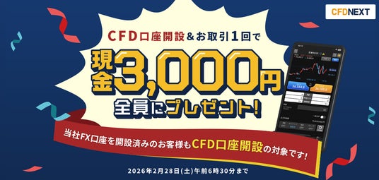 株式会社外為どっとコム(本社:東京都港区、代表取締役社長:竹内 淳)は、『CFDネクスト』におきまして、2026年2月2日(月)より「口座開設&お取引1回でもれなく現金3,000円をプレゼント!キャンペーン」を実施します。