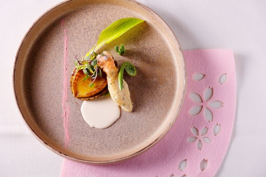 特別な日のディナーに相応しいラングスティーヌと鮑を贅沢に使用。ラングスティーヌのベニエには、桜パウダーを衣に加え、揚げたての香ばしさとともに桜の香りがほのかに漂う一品です。
