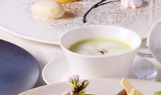 グリンピースの優しい甘さをお楽しみいただけるポタージュに生クリームと桜を浮かべました。クリーミーな舌触りと桜の風味が春の爽やかさを連想させる一品です。