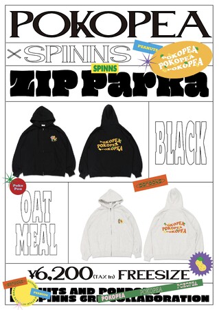 今回のコラボレーションアイテムは「ZIPパーカー」。フロントは刺しゅうの手描き風ぽこピーイラストをスピンズが描き起こしました。また、コラボレーションアイテム第5弾も、第6弾と同時期に再販する。