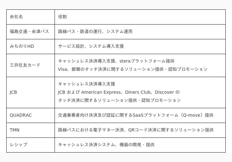 福島交通株式会社(代表取締役社長:武藤 泰典、以下:福島交通)、会津乗合自動車株式会社(代表取締役社長:佐藤 俊材、以下:会津バス)、株式会社みちのりホールディングス(代表取締役グループCEO:松本 順、以下:みちのりHD)、三井住友カード株式会社(代表取締役社長:大西 幸彦、以下:三井住友カード)、株式会社ジェーシービー (代表取締役兼執行役員社長:二重 孝好、以下:JCB)、QUADRAC 株式会社(代表取締役社長:高田 昌幸、以下:QUADRAC)、株式会社トランザクション・メディア・ネットワークス(代表取締役:大高 敦、以下:TMN)、レシップ株式会社(代表取締役社長:杉本 眞、以下:レシップ)は、2024年3月に福島交通・会津バスの運行する路線バス全車両(約540台)と、福島交通飯坂線の全駅に各種キャッシュレス決済を導入いたします。