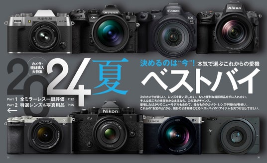 カメラは登場したばかりのニューモデルも含めて、全ミラーレス一眼を徹底評価! そのほか旬の交換レンズ、機能性の高い三脚や記録カード、そしてプリンターやPC周辺機器などが勢揃い。これらの”お宝の山”から、撮影の良き相棒となるベストバイの製品を見つけ出してください。