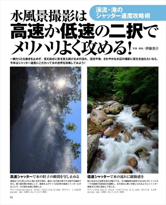 シーズン到来! 一瞬たりとも動きを止めず、変幻自在にかたちを変え続ける水の流れ。渓流や滝、爽やかな水辺の撮影で変化を加えたいなら、今年はシャッター速度にこだわってみましょう。高速で水飛沫を写し止める、低速で流れを幻想的に描くなど、写真だからこそ表現できる水の絶景の狙い方を、豊富な作例とともにテクニック解説します。