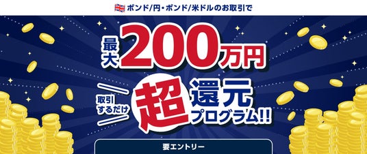 本プログラムではFX口座におけるポンド/円・ポンド/米ドルの新規約定数量に応じて最大200万円の現金をプレゼントいたします。また、対象通貨ペアは今後、追加される可能性もございます。