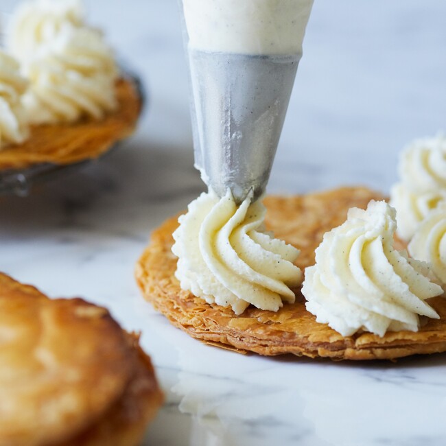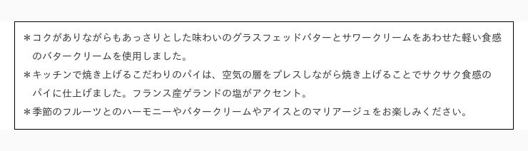 フランス産ゲランドの塩がアクセントになったこだわりパイは、空気の層をプレスしながら焼き上げキャラメリゼし、香ばしくサクサク食感に。バタークリームは、フルーツやパイとの調和を考え、グラスフェッドバターとサワークリームをあわせた軽い口当たりに仕上げています。