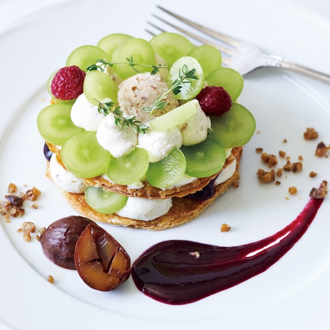 「シャインマスカットと栗のミルフィーユ」は、バタークリーム、アールグレイホイップをサンドし、みずみずしいシャインマスカット、渋皮栗、カシスソースをあわせて秋だけの味わいに。