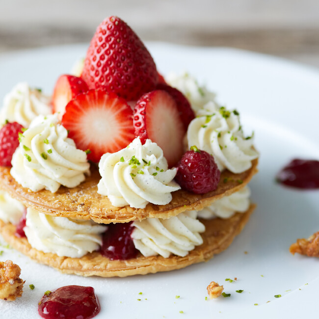 「苺とラズベリーのミルフィーユ」は、軽い口当たりのバタークリームとストロベリーホイップをサンドし、フレッシュな苺、まろやかなバニラアイス、ナッツグラノーラをあわせました。