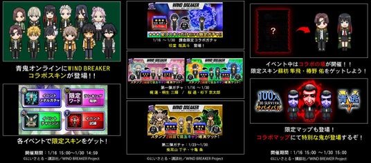LiTMUS株式会社(本社:東京都港区、代表取締役社長:桑村 崇一郎)は、最大100人のキャラクターが青鬼から逃げ回り、マップの中で最後の一人として生き残ることを目指すオンライン・サバイバルゲーム『青鬼オンライン』にて、TVアニメ『WIND BREAKER』との2回目となるコラボイベントを1月16日(金)15:00より開始します。