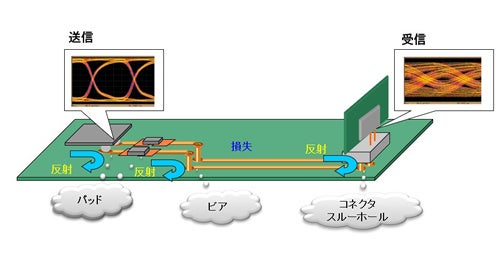 生成AIシステムの急激な普及・進化によりAI半導体やAIサーバー、データセンターの大容量化・高速化が進んでいます。これらの機器に実装されるPCBでは、多層化・構造の複雑化(注2)が進んでおり、高速伝送を阻害する伝送損失や信号反射の低減への対策が重要になっています。特に多層PCBの層間を電気的に接続するビアに関しては、高速伝送で使用される高周波信号が変化する構造的な変化点となっており、信号の反射を抑えるビアの特性インピーダンス(注3)制御が重要な要素技術のひとつとなっています。