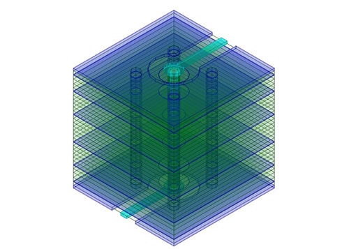 OTCでは、これらの課題を解決するために、複雑化する高周波ビアの特性を考慮した「高周波ビア高精度シミュレーション技術」の開発に成功しました。具体的にはPCB製造前段階に、新技術のシミュレーション結果に基づきビアの構造・寸法・製造マージンを自社工場の製造ラインに合わせて総合的に検証・最適化し、信号品質の要求を満たす最適条件を抽出します。自社で長年蓄積してきた評価データをもとに、仕上り寸法や製造ばらつき、材料物性値などのパラメータを独自データベースとして構築しており、3次元電磁界解析ツールを活用した高精度なビアモデリングを可能とし、実機における確実な信号特性の確保を実現しました。
