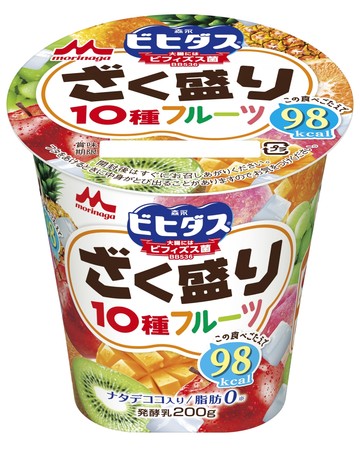 「ビヒダスヨーグルト ざく盛りフルーツ」は、りんごや白桃など10種類のフルーツ入りヨーグルトです。大き目にカットしたたっぷりのフルーツ果肉と果汁、コリコリとしたナタデココの食感や味わいを存分にお楽しみいただけます。200gと満足な食べごたえでありながら、ヘルシーな脂肪ゼロタイプのヨーグルトでカロリーはわずか98kcalです。脂肪分やカロリーが気になる方も気軽にお召しあがりいただけます。
