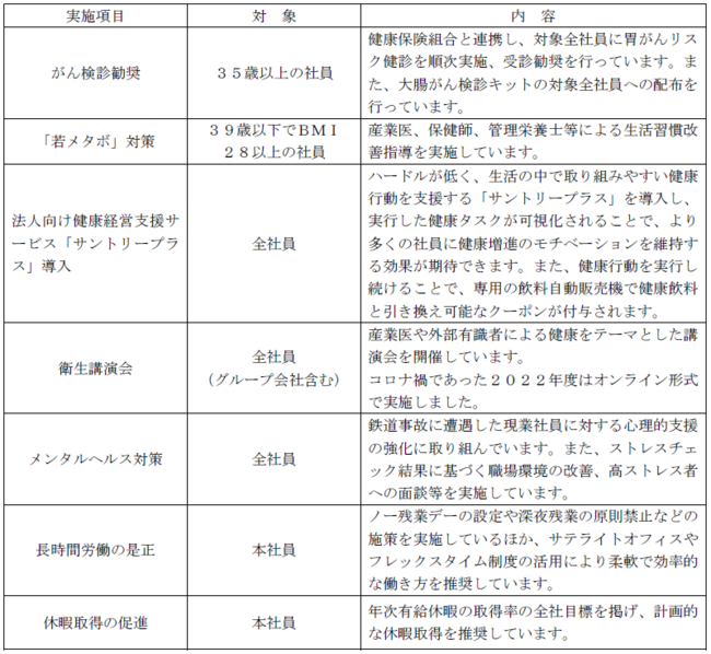 近年では生活習慣病予防の一環として、健康保険組合と連携し、35才以上の社員全員に胃がんリスク検査を実施し高リスク者への受診勧奨を行っているほか、特定保健指導の対象外である39歳以下の社員のうち一定のBMI値に達した者について、産業医や保健師、管理栄養士等による生活習慣の改善指導を行っています。また、2017年度から2021年度までウォーキングをテーマとした健康増進策「京王ヘルスチャレンジ」において運動の習慣付けを図り、健診結果等で効果を検証しました。2022年度はより多くの社員に健康増進の意識を持ってもらうことを目的に、法人向け健康経営支援サービス「サントリープラス」を導入し、運動への関心が薄い層への働きかけを強化しました。