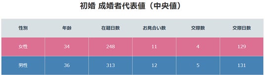 代表的な成婚者像として、2024年における初婚者は、女性34歳、男性36歳となりました。また、在籍日数「約9ヶ月(男女合わせた中央値)」、交際日数「約4ヶ月」と短い期間で意思決定していることが言えます。これは、一般的な平均交際期間4.3年(第16回出生動向基本調査 独身者ならびに夫婦調査)の1/12の期間となります。