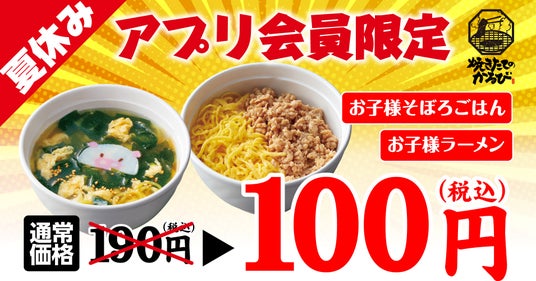 株式会社物語コーポレーション(本社:愛知県豊橋市/代表取締役社長:加藤 央之)は、熟成肉を使用した「焼きたてのカルビ丼」と「ユッケジャンスープ」の専門店『焼きたてのかるび』において、2024年8月9日(金)から2024年8月18日(日)までの期間、『焼きたてのかるび』公式アプリで、おこさまメニューを100円(税込)でご注文できるアプリクーポンを配信いたします。この機会に、ぜひご家族でもお気軽にご利用ください。