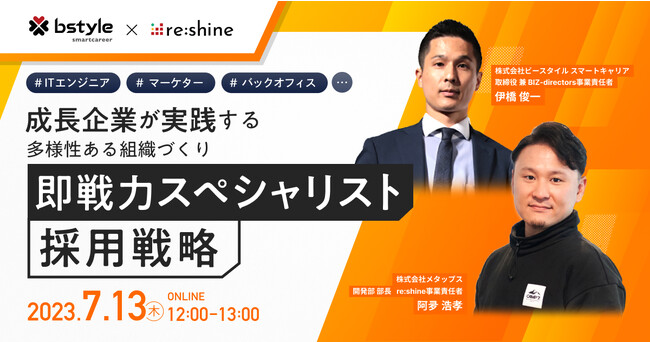 ビースタイルグループで時短など多様な働き方を可能にする人材派遣・紹介サービスを提供する株式会社ビースタイル スマートキャリア(本社:東京都新宿区、代表取締役社長:三原邦彦)は、2023年7月13日(木)に、株式会社メタップス(本社:東京都渋谷区、代表取締役:山崎祐一郎)と共同で無料のオンラインセミナーを開催します。「即戦力スペシャリスト 採用戦略 -成長企業が実践する 多様性ある組織作り-」をテーマに、即戦力のスペシャリスト人材を獲得するための採用戦略や組織作りについて2社の取り組みを交えてお話しします。
