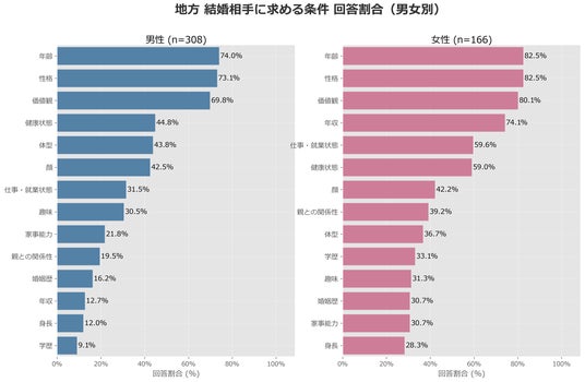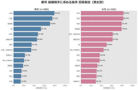 活動会員へのアンケート調査から、結婚相手に求める条件には、性別だけでなく都市と地方で傾向の違いがあることが明らかになりました。共通して「性格」や「価値観」の一致が重視される一方、都市部の女性は82.6%が「年収」を重視しており、地方でも74.1%と高水準に。