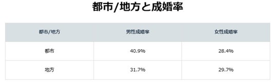 都市では高学歴・高年収の男性が多い傾向にあることや、女性の都市への転入超過により「女性余り」となっていること等が起因し、男性の成婚率が地方より9.2ポイント高くなることが分かりました。
