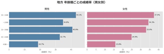 一方、女性の成婚率には地域による顕著な差が見られました。都市部では若年層の成婚率が高く、年齢が上がるにつれて成婚率が低下し、地方では30代前半の成婚率が最も高く、都市の20代女性と同等の37%を記録しました。
