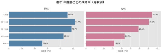 都市と地方における年齢層ごとの成婚率を比較したところ、男性は全年齢層で都市部の方が成婚率が高い傾向にありました。年齢による傾向の違いは、都市・地方間で大きな差は見られませんでした。