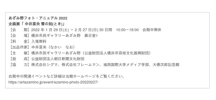 「あざみ野フォト・アニュアル 2022」企画展では、写真家・中井菜央の個展を開催します。中井は、雪をモチーフにしたシリーズを手掛けたいとの思いから、2015 年より毎冬 100 日を新潟県津南町で過ごして撮影を続けてきました。本展では、約 6 年間撮りためてきた複数のシリーズのうち、初公開となる「雪の刻(とき)」と題された、雪国特有の重層的な「時間」の響きを捉えたシリーズを紹介します。