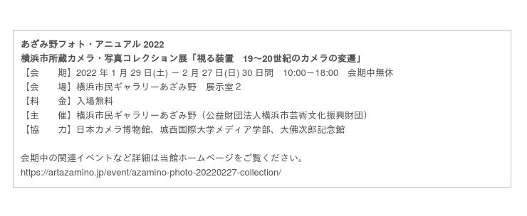 横浜市民ギャラリーあざみ野(横浜市・青葉区)では、写真表現の現在を切りとる企画展と、収蔵する横浜市所蔵カメラ・写真コレクション約1万件を様々な切り口で紹介するコレクション展を「あざみ野フォト・アニュアル」として同時開催しています。