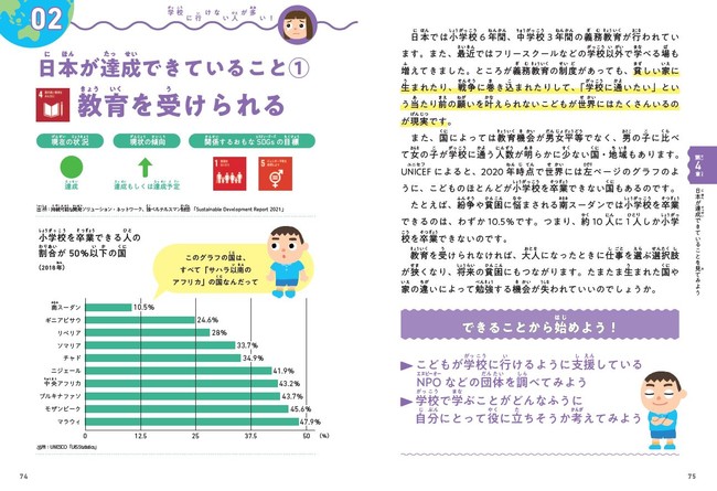 また、それぞれの項目ごとに「できることから始めよう!」というコーナーを設けています。ここでは「目標の達成のためにはどうしたらよいのか考えてみよう」「なぜこうした問題が起きているのか調べてみよう」といった問いかけを用意しています。このコーナーをきっかけに親子で話し合ったり、世界が抱えている問題について一緒に調べたりすることもできます。
