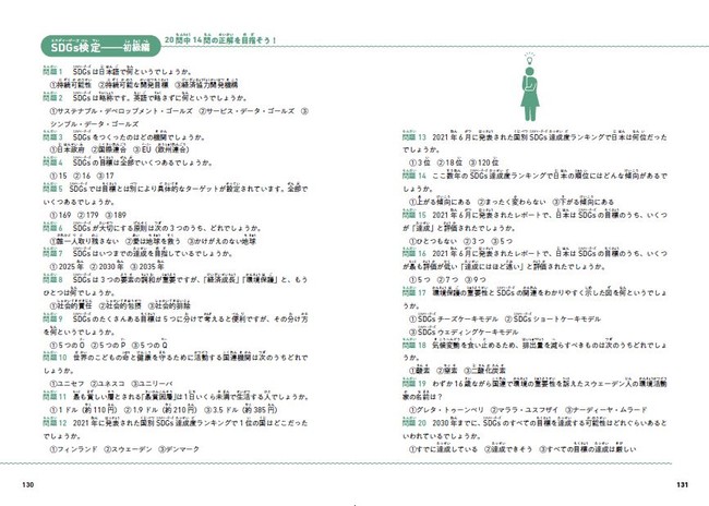 巻末には本の内容を復習する「SDGs検定」の問題・解答を掲載しています。初級編・上級編に分けられており、自分のSDGsへの理解度を知ることができます。