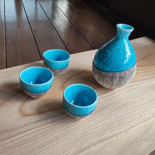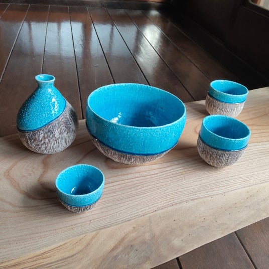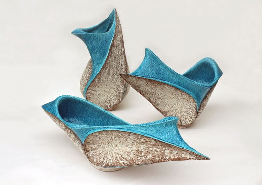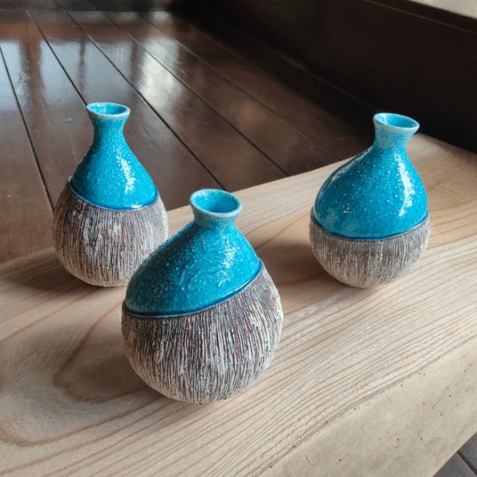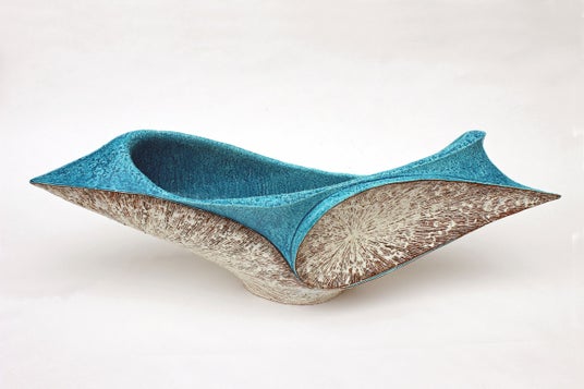 田上は信楽の土を手びねりで造形し、青の釉薬を使って焼き上げています。「殻(から)」というテーマのもと、立体作品のなかに、からっぽの「空」、卵の「殻」、そして生命の誕生の源である海の青、空の青など、多様な意味を絡ませています。白い釉薬で装飾され、掻きおとしの技法を使い、中心から放射状に広がるように線が入っており、空洞のある形状は「内側」と「外側」の関係や、卵の殻から生まれ出るようなエネルギーも感じさせます。